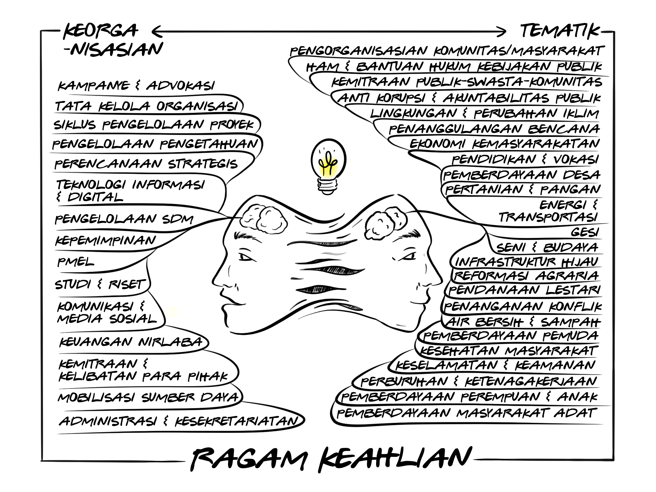 Mempertemukan keahlian dan potensi kontribusi individual anggota maupun jaringan masyarakat sipil dengan kebutuhan dukungan bagi program sosial kemanusiaan yang dilaksanakan oleh beragam aktor pembangunan Indonesia.