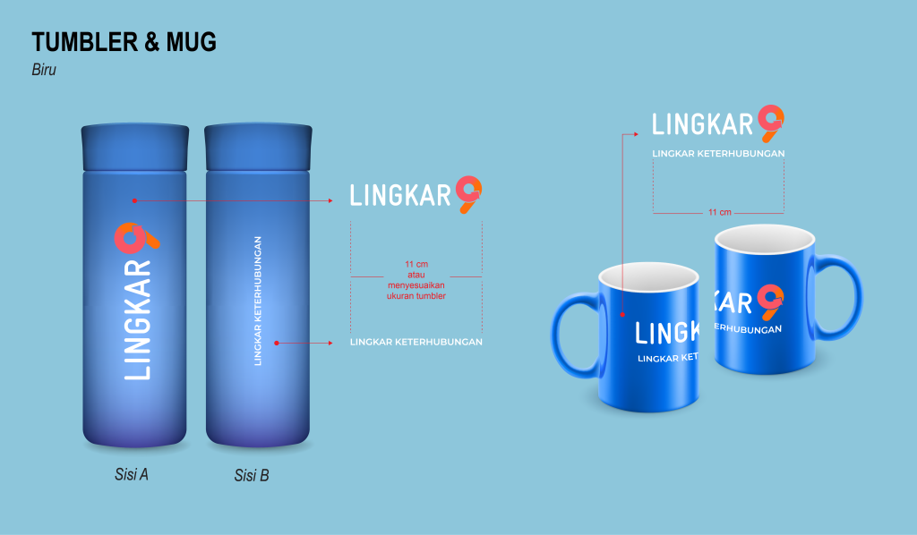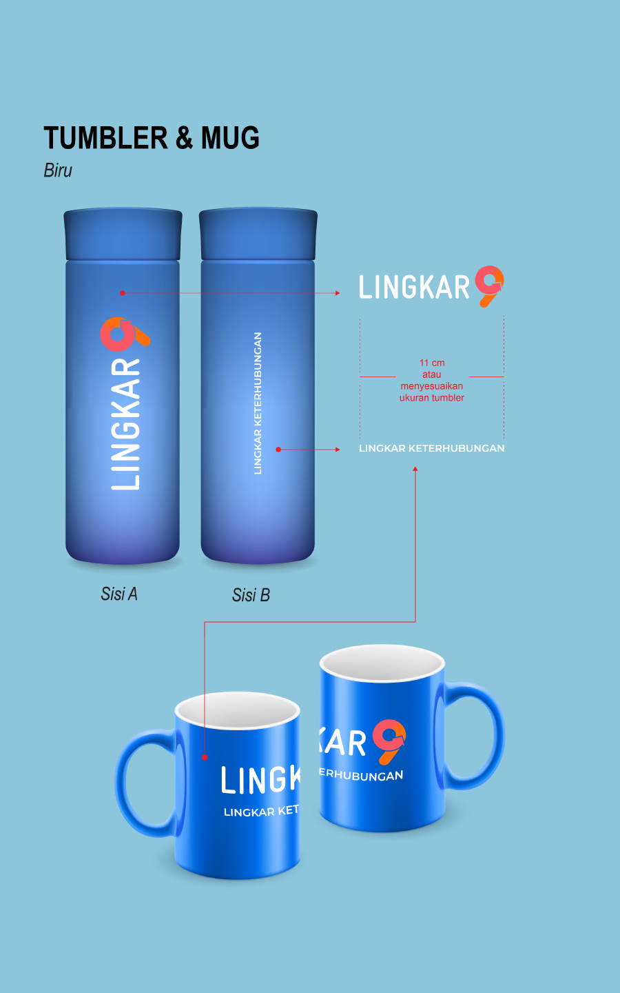 Tumbler dan Mug berwarna biru dengan logo Lingkar9.