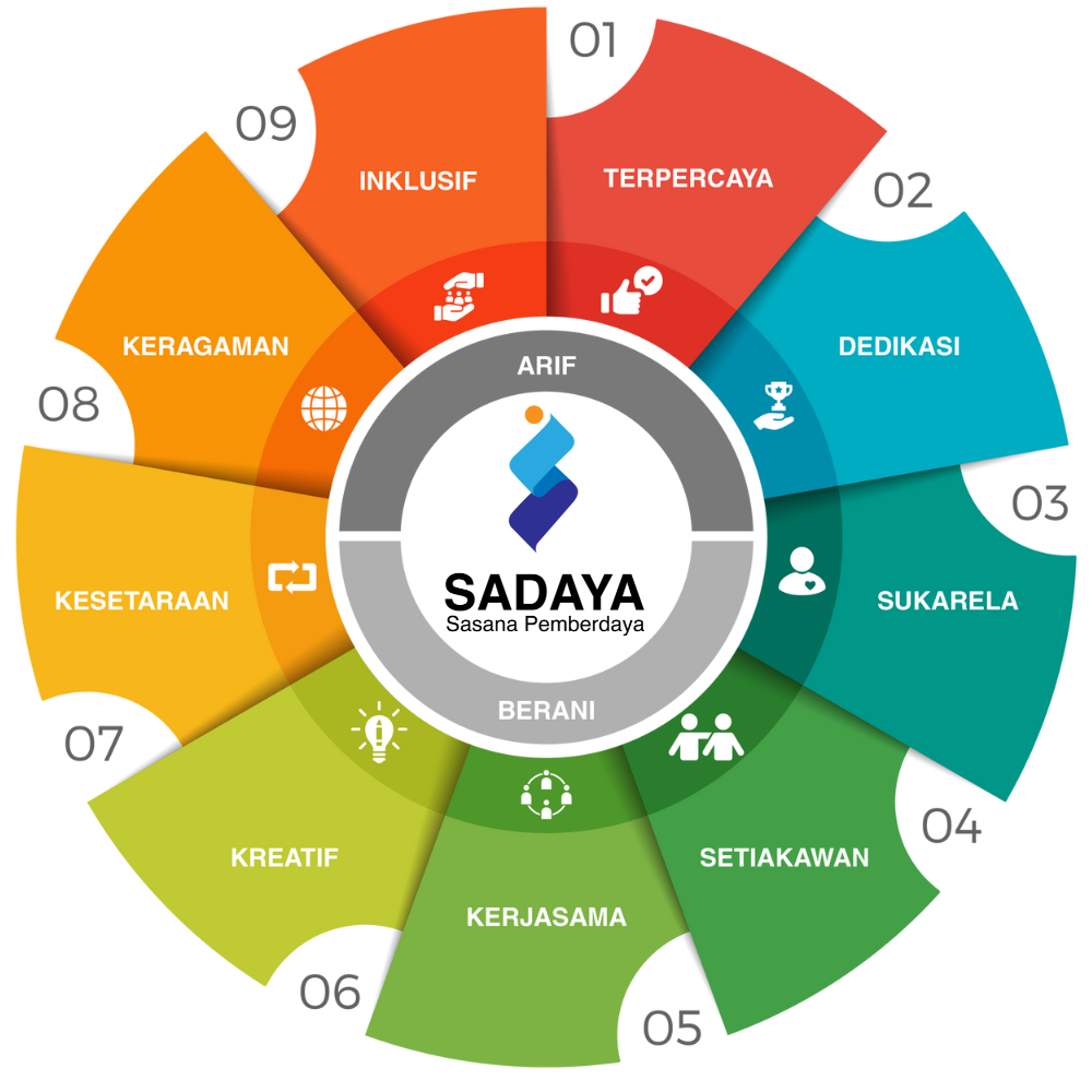 Sadaya mendasarkan geraknya pada nilai Kearifan dan Keberanian; dengan memegang teguh prinsip-prinsip Terpercaya, Dedikasi, Sukarela, Setiakawan, Kerjasama, Kreatif, Kesetaraan, Keragaman dan Inklusif.